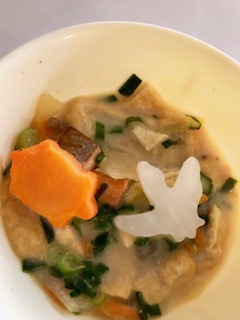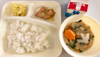 今日の献立は、ごはん、牛乳、鶏肉の甘辛焼き、かす汁、くりきんとんでした。