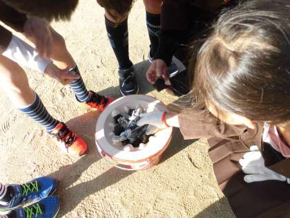 「えーっ! 全然つかない!」「先生、マッチの火じゃ小さすぎて無理やで!」とあちこちから悲鳴が上がりました。マッチを始めてみた児童も多く、「こすっただけで火が付くなんて不思議やなぁ」とつぶやいている子もいました。