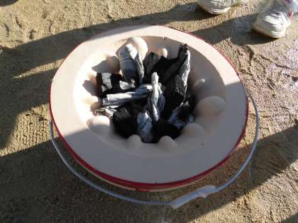 最初に使い方の説明を受けた後、さっそく七輪の中に入れた炭に火をつけようとしますが……