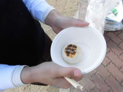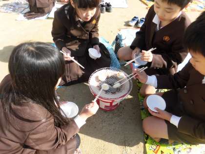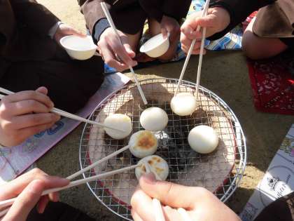 そして、炭に完全に火がうつり、いよいよ子どもたちが楽しみにしていたおもち焼きがスタートです。七輪の上に網を置き、子どもたちはおもちをそぉっと網の上に置いて焼き始めます。「なかなか焼けないなぁ」「あ、ふくらんだ!」「ああ! こげてしまった!」と目の前のおもちの焼け具合を真剣に見つめていました。