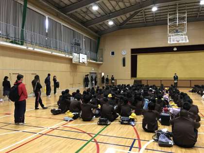 最初に、講堂で生徒会の皆さんから中学校生活についてのお話をしてもらいました。また、中学校での一日を劇で再現してもらい、中学校生活のイメージがつかめました。
