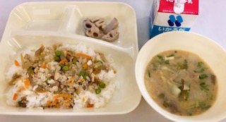 今日の献立は、鶏ごぼうごはん、牛乳、干しずいきのみそ汁、焼きれんこんでした。