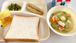 今日の献立は、食パン、アプリコットジャム、牛乳、わかさぎフライ、スープ煮、三度豆とコーンの甘酢あえでした。