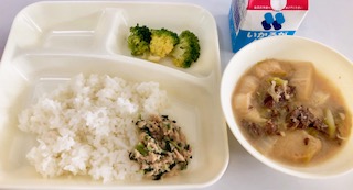 今日の献立は、ごはん、牛乳、すき焼き煮、ブロッコリーのしょうがづけ、ツナっ葉いためでした。