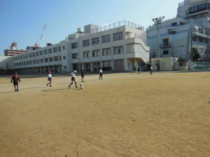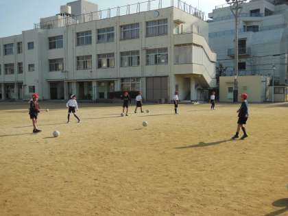体ほぐしの運動が終わった後は、サッカーのパス練習をしました。みんな相手の正面にボールを蹴ろうと何回も練習し、頑張っていました。