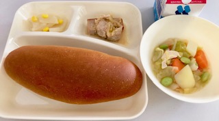今日の献立は、黒糖パン、牛乳、まぐろのしょうゆマヨネーズ焼き、鶏肉とじゃがいものスープ煮、だいこんのサラダでした。