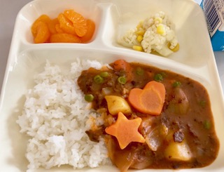 今日の献立は、ハヤシライス、牛乳、カリフラワーとコーンのサラダ、みかん(缶)でした。