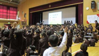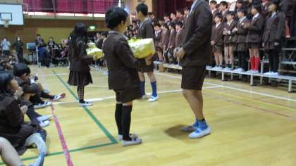 今日は土曜日授業で、6年生を送る会をしました。1年生からは6年生へ感謝の手紙を渡しました。6年生からは、ぞうきんをもらいました。全学年そろったゲームでは、6年生の好きな給食などのクイズが出され、1年生も楽しそうに答えていました。