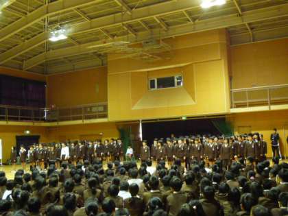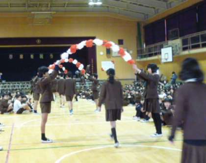 6年生は、拍手に迎えられ、晴れがましい表情で花のアーチをくぐりました。