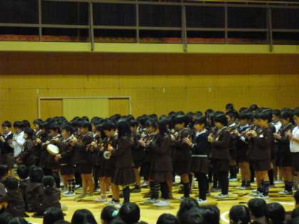 お世話になった6年生への感謝の気持ちを込めて、1年生はお手紙の、2〜5年生は音楽のプレゼント。今日のために、呼びかけの練習もしてきました。
