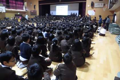ほかの学年の演奏を鑑賞した後は、六年生と一緒にゲームを楽しみました。六年生に関するクイズを子どもたちは楽しんでいた様子でした。
