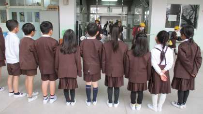 今週は1年生があいさつ当番をしました。学校の玄関で登校して来る児童に、元気いっぱいにあいさつしていました。