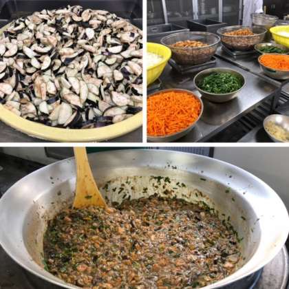 2学期の給食2日目です。マーボーあつあげ丼に使用するなすは、山梨県産が納品されました。暑い日でも食欲がわくように、にんにくやしょうが、トウバンジャンを香りよくいためています。きゅうりの中華あえは、きゅうりを焼き物機で蒸し、ごま油などを使ったタレをかけ、あえています。ぶどうゼリーは、冷たくて夏にぴったりのデザートです。