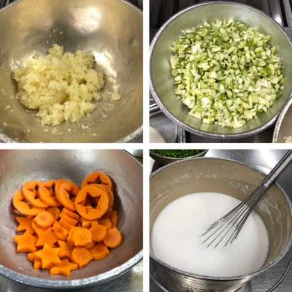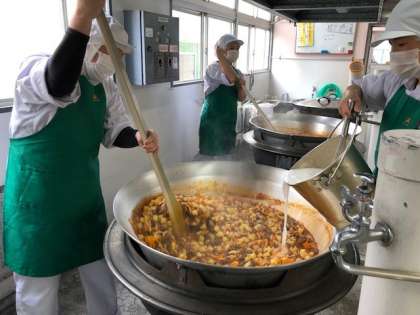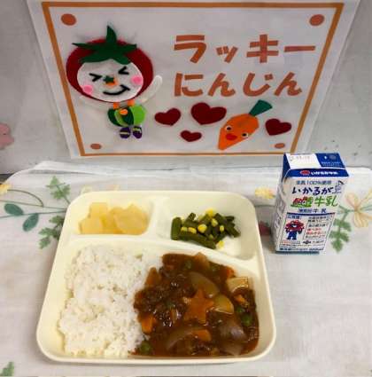 ハヤシライスは、にんにくやセロリで香りづけをし、食欲がわくようにしています。水どき上新粉でとろみをつけているので、小麦アレルギーの人も食べられます。ハヤシライスには、本校の給食調理員さんがラッキーにんじんを入れてくれていました。型をぬいた外側も入っていたので、たくさんの児童が「ラッキーにんじんが入っていた!!」と見つけていました。