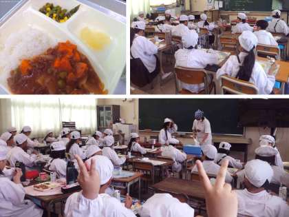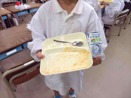 1年生の教室では、ハヤシライスのお皿と牛乳パックを重ねない返却方法を実践していました。牛乳パックの底をハヤシライスで汚さないようにするためです。先生から教わったことを学級のみんなが気を付けていました。後片付けをしてくださっている方々のことを考えて返却することの大切さを感じました。