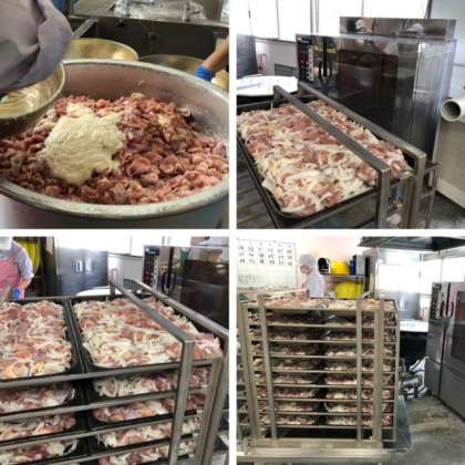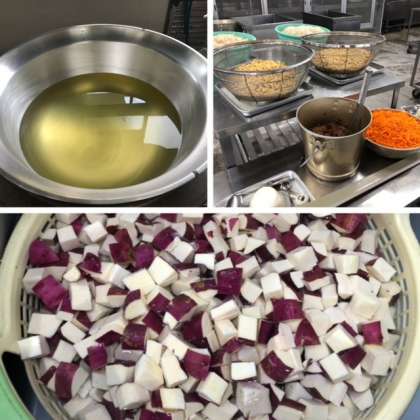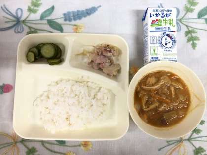 鶏肉は、塩こうじで下味をつけ、たまねぎを混ぜ合わせて焼き物機で焼いています。塩こうじで下味をつけた鶏肉はとてもやわらかく、味がしみ込んでいておいしかったです。みそ汁は、にぼしでだしをとっています。徳島県産のさつまいも(鳴門金時)が入っていました。