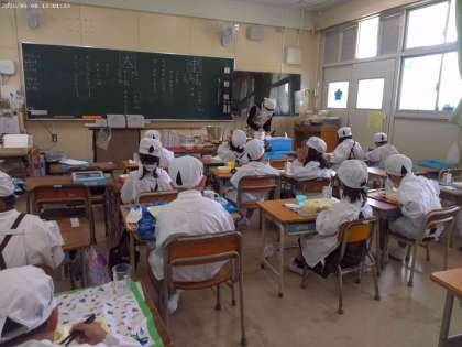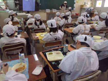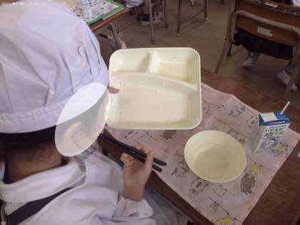 1年生の教室では、「お肉がおいしい!!」と鶏肉の塩こうじ焼きが人気がありました。また、食器を手で持って姿勢よく給食を食べている1年生がいました。ごはん粒を残さないようにおはしを上手に使って最後までごはん粒をしっかり取って食べていました。このようなよい取り組みは、みんなで実践していけたらいいと思います。