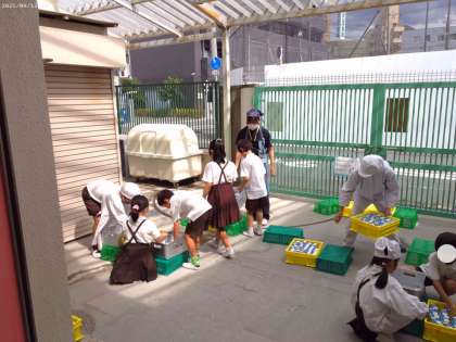 昨日に引き続き、今日も教育実習生2名が給食の返却指導を行いました。実習生が小学生の頃は、牛乳パックではなくビンだったこと、残った牛乳は給食当番がバケツに返していたことなどを思い出していました。返却指導をしてみて、高学年になるほど苦手なものでもしっかり食べている、残った牛乳を何十本もバケツに入れていくことはとても大変など、様々なことを感じたようです。近い将来、好き嫌いをしないで、感謝の気持ちをもって食べることの大切さを伝えていける先生になってほしいと思います。