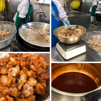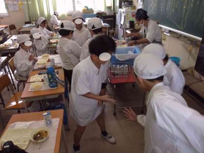 ヤンニョムチキンは、油で揚げた鶏肉に「ヤンニョム」という甘辛いタレをからめて作っています。とても人気があり、数日前から「今度ヤンニョムチキンが出るんやって!!」という声が聞かれました。1年生は、給食での初めてのヤンニョムチキンに「今日の給食がめっちゃおいしかったから、すぐに食べ終わった!!」と大好評でした。4年生の教室では、牛乳のおかわりをめぐって牛乳じゃんけんが行われていました。じゃんけんに勝った人はうれしそうにもらっていました。