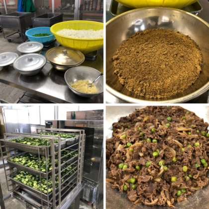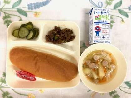 9月の給食最終日です。牛肉のデミグラスソース煮は、新食品のデミグラスソース(米粉)を使っています。小麦や乳、りんごなどのアレルギーの人が多い食品は入っていません。昨年度までの牛肉のソース煮を基に新しくして、デミグラスソースのコクを追加し、アレルギーのある人でも食べることができるようにしています。ピクルスは、きゅうりを焼き物機で蒸し、調味液につけこんでいます。味が十分にしみていました。