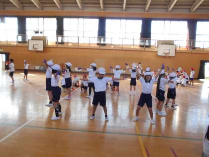 赤チーム白チームに分かれて踊り、見合いっこをしていました。