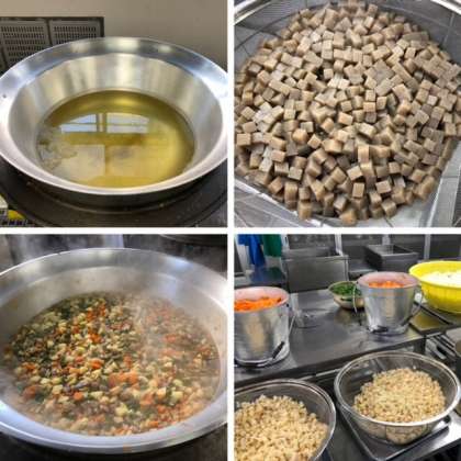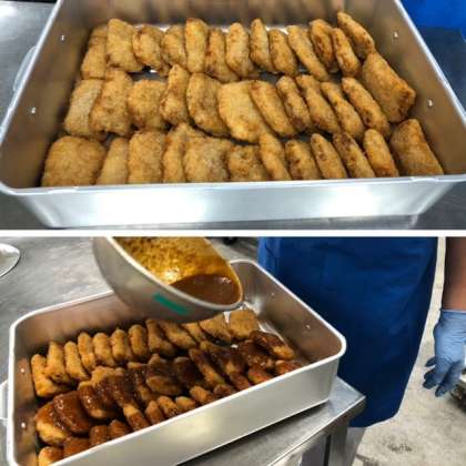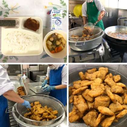 みそカツは、愛知県の郷土料理です。一口トンカツを油で揚げ、砂糖やみりん、八丁みそ、赤みそなどで作ったタレがかかっています。煮ものは、けずりぶしでだしをとり、鶏肉やじゃがいも、こんにゃく、たまねぎ、たけのこ、にんじん、さんどまめなどが入った具だくさんの煮ものでした。