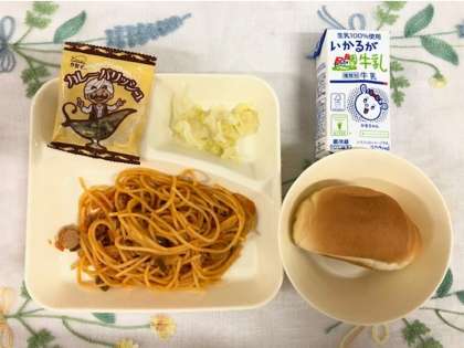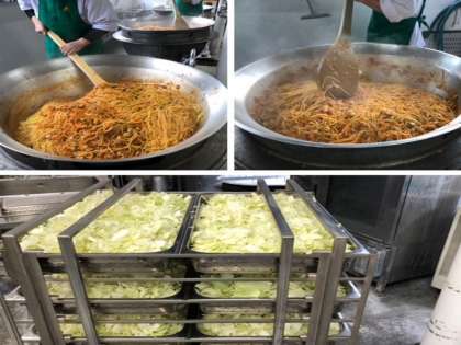 「イタリアンスパゲッティって何だろう?」という話題になり、調べてみると、関西ではケチャップ味の炒めスパゲッティであるナポリタンのことを「イタリアンスパゲッティ」というそうです。豚肉やウインナー、たまねぎ、にんじん、ピーマン、マッシュルームが入っていました。本校は650人分の給食を作っているので、大きな釜を2つ使って作りました。サワーキャベツは、キャベツを焼き物機で蒸しています。