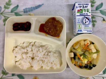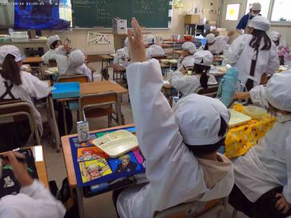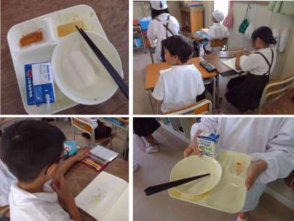 和風ハンバーグは、ハンバーグがとてもやわらかく、てり焼きハンバーグのようなタレもかかっていて、大人気でした。「ごはんにかけて食べた!!」という児童もいました。また、どこかで買っていると思ったのか、「このタレは手作りですか?」などと聞いてくる人もいました。金時豆は、苦手な人が多かったですが、減らしてもらって残りはがんばって食べようとしていました。1年生もお皿に金時豆が残っている人はほとんでいませんでした。「金時豆のおかわりいる人?」と担任の先生が呼びかけると、手をあげておかわりをしていました。早くに食べ終わった人も多く、絵を描いて食後の時間をゆっくりと過ごしていました。