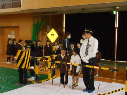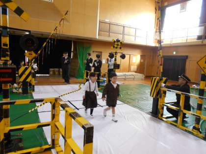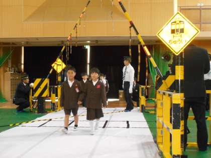 本物さながらの踏切のセットをもって来てもらい、それを使ってわたり方の練習をしました。