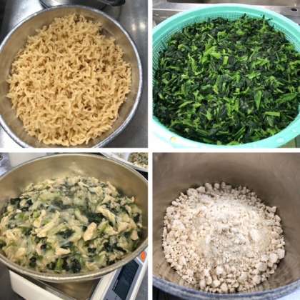 ほうれんそうのクリーム煮は、本校では、ほうれんそうのグラタンから調理法を変更しました。小麦粉や牛乳を使わず、28品目アレルゲンフリーのシチュールウの素で味つけし、上新粉でとろみをつけています。マカロニも米粉のものを使っています。