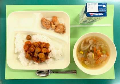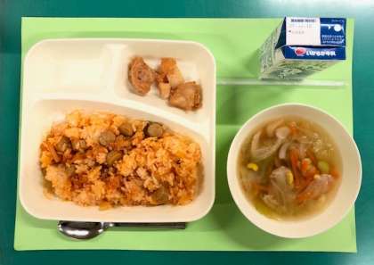 ケチャップライスは、ウインナー、ベーコン、たまねぎ、ピーマンをいため、ケチャップ、ウスターソース、塩、カレー粉で味つけしています。教室で配膳する時にごはんの上に盛り付け、食べる時に混ぜ合わせます。スプーンで混ぜ合わせているうちに、オムライスの中に入っているケチャップライスそのものになります。