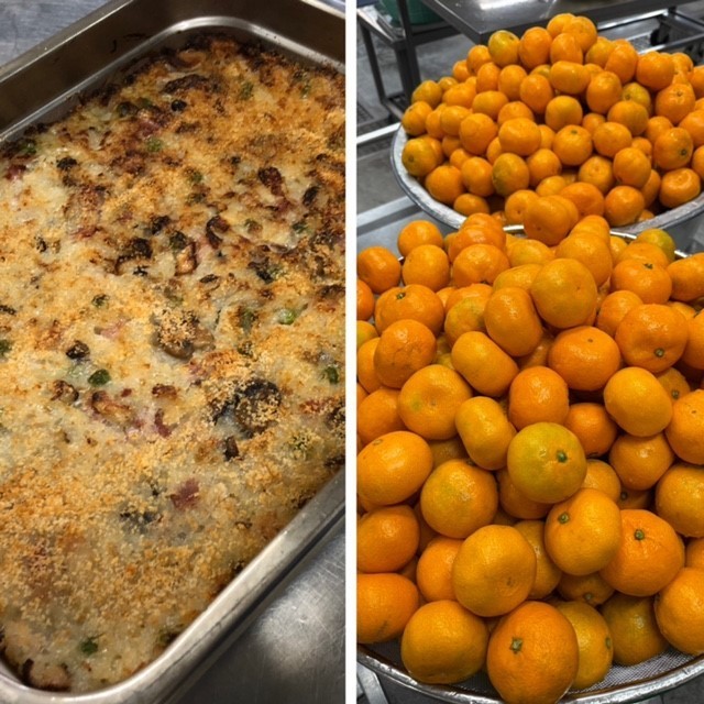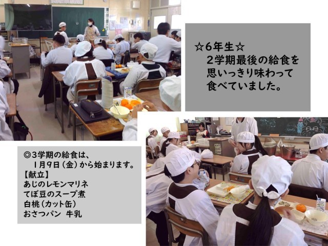 きのこのドリアには、しめじやエリンギ、マッシュルームが入っていました。牛乳や小麦粉は使わず、28品目アレルゲンフリーのシチュールウの素で味つけしています。そのため、牛乳や小麦にアレルギーのある児童も食べることができます。シチュールウの素を使ったドリアは、今回が初登場になります。味はどうかなと思って6年生に聞いてみました。「きのこが苦手だけど食べられた。」「グリンピースも入っていたけどおいしかった。」「味つけが最高!!」「1年間に5回は食べたい。」「ちょうどよい焼き色がついていておいしい。」など、大好評でした。みかんは、佐賀県産が納品されました。給食返却時には、給食調理員さんに「1年間ありがとうございました。」「今年もおいしい給食を作ってくれてありがとうございました。」など、全学級が挨拶をしていました。