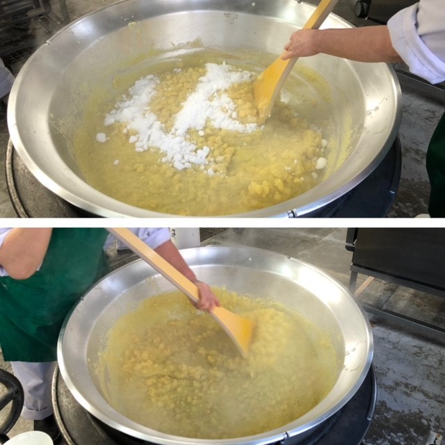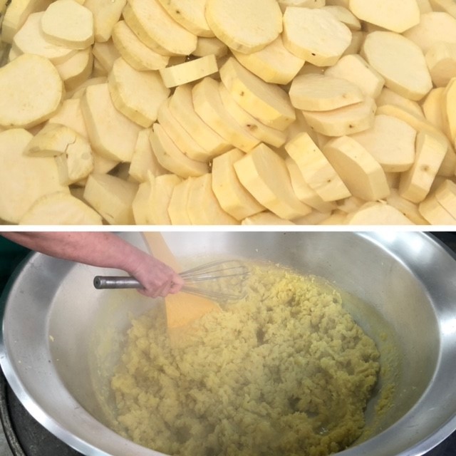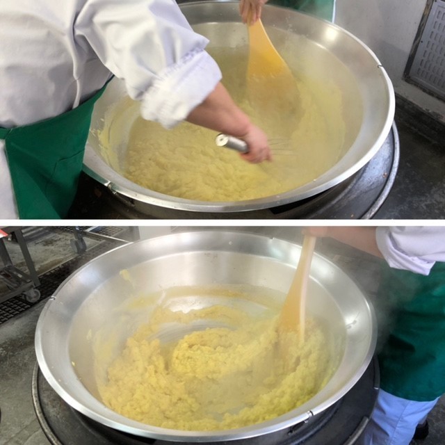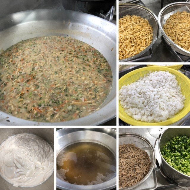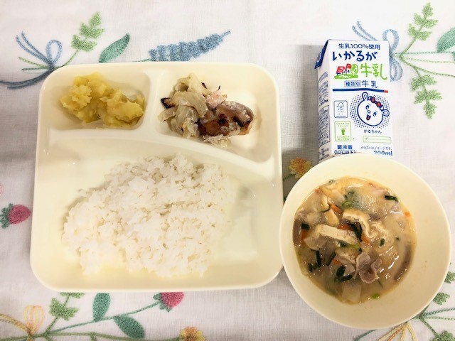 鶏肉の塩こうじ焼きは、鶏肉とたまねぎに塩こうじで下味をつけ、焼き物機で焼いています。かす汁は、豚肉やつきこんにゃく、うすあげ、だいこん、にんじん、青ねぎが入っていました。児童が食べやすいように酒かすの割合を少なくし、白みそや赤みそを使って味つけしています。くりきんとんは、正月のおせち料理の一つです。さつまいもの皮をむき、釜でやわらかく煮てつぶし、なめらかになるまで泡だて器やスパテラ(大量調理用の大きなしゃもじ)を使って混ぜ続けます。砂糖やみりん、塩で味つけしてできあがりです。大変な調理ですが、児童がおいしく食べられるように給食調理員さんが丁寧に作ってくれました。5年生の教室では、どのおかずも大人気で「一瞬でなくなった!!」そうです。