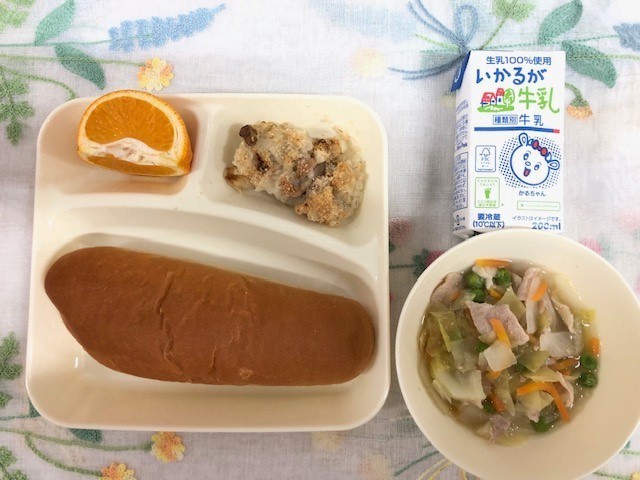 押麦は、大麦の皮をむいて蒸し、ローラーで平たくつぶしたものです。食物繊維を豊富にとることができます。シチュールウの素で味つけし、乳製品を使っていないので、乳にアレルギーのある児童も食べることができました。いよかんは、愛媛県産が納品されました。とても甘くておいしいいよかんでした。3品でボリュームのある献立でしたが、全学級でしっかり食べることができました。