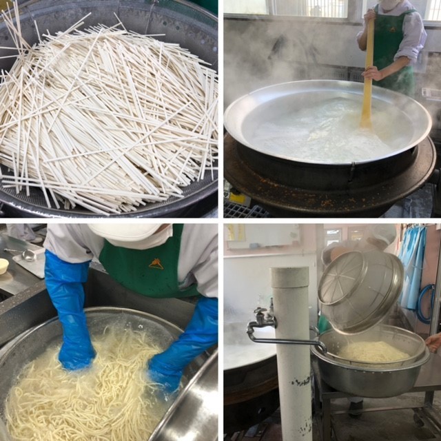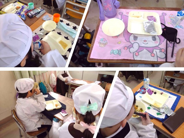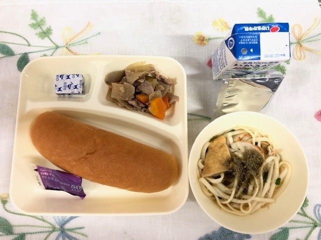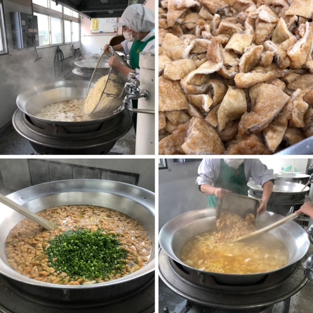 なにわうどんは、大阪発祥といわれているきつねうどんに、昔から大阪で作られてきたとろろこんぶをかけて食べることから、大阪市の給食では「なにわうどん」と呼んでいます。うどんは乾めんを使い、ゆでて流水で洗って使っています。うすあげは、1/16の三角に切って、甘辛い調味液に漬け込み、焼き物機で煮ています。1年生の教室では、「なにわうどんおいしい!!」「とろろこんぶ、めっちゃおいしい。」「なにわうどんは地域の料理でいいね。」などの感想が聞かれました。大阪の味を知り、味わい、伝えていくことの大切さを感じました。