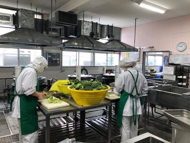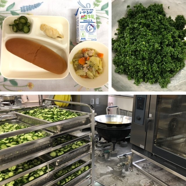 ずいきは、さといもの葉柄(葉と茎をつなぐ部分)のことです。干したずいきが納品され、給食室で十分にもみ洗いした後、ぬるま湯でもどし、ゆでて使用しています。全学年でほとんど残食がなく、しっかり食べていました。