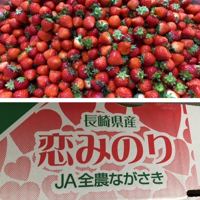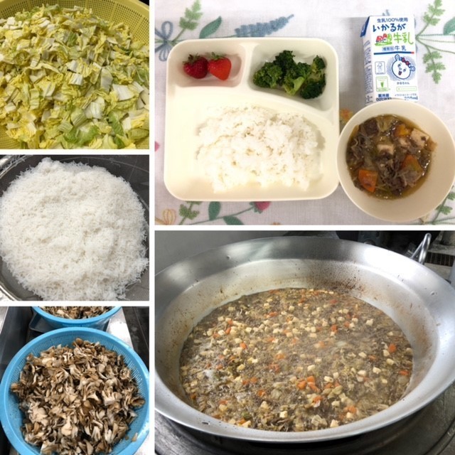 すき焼き煮は、糸こんにゃくやはくさい、まいたけなどを使用しています。食材から出る水分と砂糖やしょうゆの調味料のみで煮ています。いちごは、長崎県産の『恋みのり』が納品されました。