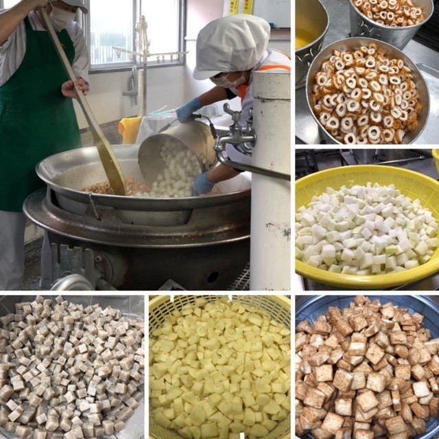 3月3日(火)【献立】関東煮(うずら卵の除去食)、きゅうりの梅風味、とら豆の煮もの、ごはん、牛乳