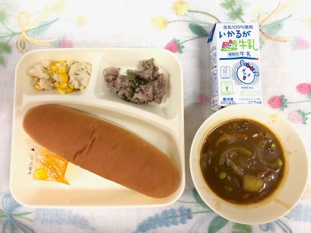 3月4日(水)【献立】豚肉の香味焼き、カレースープ、 カリフラワーとコーンのサラダ コッペパン みかんジャム 牛乳
