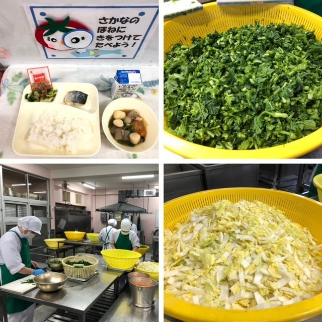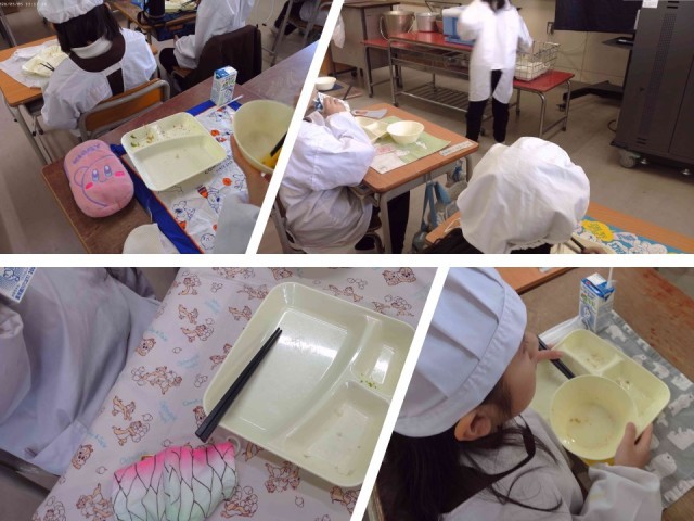 さごしは、焼き物機で230度、15分間焼き、みりん、塩こうじ、湯、ゆず(果汁)を合わせて煮立てたタレをかけています。1年生の教室では、「このタレに何かレモンみたいなものが入ってる?」とタレに柑橘類が使われていることを感じている人がいました。「僕のさごしには骨がいっぱいあったけど、食べられた。」「骨がほとんどなかった。」「なのはなが苦いなと思ったけど、全部食べた。」「なのはなを3回もおかわりした。」「なのはなを減らしてもらったら、かつおぶしをかけた時にかつおぶしだらけになった。」など、いろいろな感想が聞かれました。