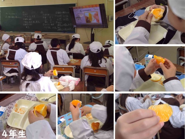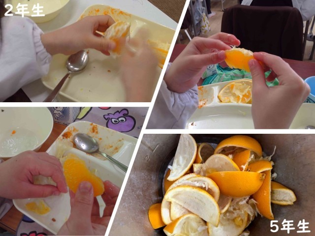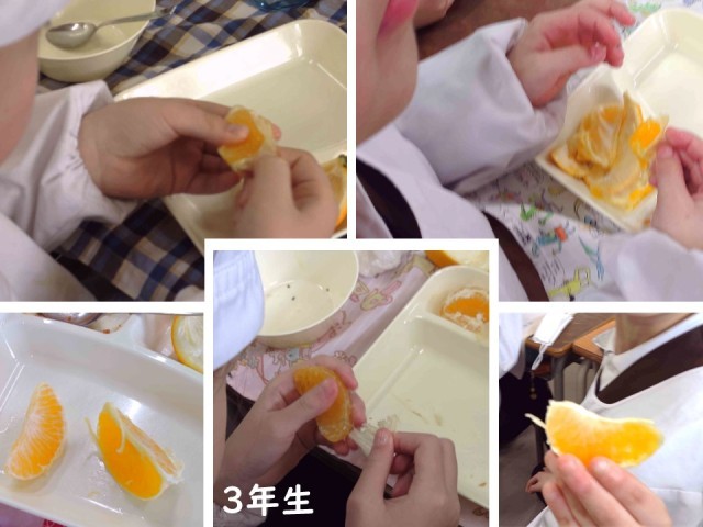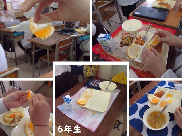 とうふのミートグラタンは、牛ひき肉やとうふ、大豆(粒状)などが入ったケチャップ味のグラタンです。焼き物機で焼いています。はっさくは、広島県で生まれた果物です。今日の給食では、和歌山県産が納品されました。本校では、全学年で『皮むき名人になろう』と取り組みました。給食委員会の児童がはっさくの皮の上手なむき方を紹介し、児童一人一人が外側の厚い皮と薄皮の皮むきにチャレンジしました。6年生は、「これであってるかな?」などと言いながらも、みんな上手にむいて食べていました。苦みのある薄皮も「そんなに苦くない。おいしいよ!!」と言いながら食べている人もいました。4年生は、給食委員会のお手本通りに、順番に、確実にむいていました。とてもきれいにむくことができていました。3年生は、「見て見て!!上手にむけたよ。」と自信たっぷりで、周りの人に見せていました。2年生は、難しいながらもがんばっていました。食べてみて、「すっぱい!!」と感想を言っていました。給食室に返却された5年生の食缶が、はっさくの外側の皮と薄皮のみで実がついておらず、あまりの上手な食べ方に驚きました。
