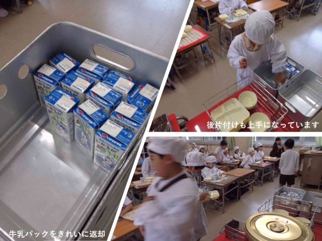 給食が始まって数日ですが、1年生の教室では、「牛乳が苦手だったけど、少しずつ飲めるようになってきた。」などの言葉を聞くことができています。初日、2日目とたくさん残っていた牛乳ですが、今日は1年生全体で初日の1/4まで残食が減りました。また、お野菜がたくさん使われているおかずも、たくさんの人が手をあげて先生におかわりを入れてもらっていました。食べ終わってから、食器かごや牛乳ケースに返却する際は、お皿やスプーンの向き、お皿にごみが残っていないか、牛乳パックに牛乳が残ったままになっていないかなど、一つずつ確認をしながら返却していました。
