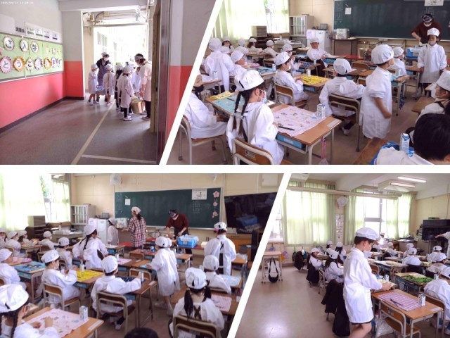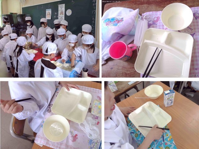 今日の給食は、大人気メニューの鶏肉のたつたあげです。どの学年の児童も朝から「今日は、からあげ、からあげ!!」「めっちゃ楽しみ。」「絶対おいしいやん!!」などと、楽しみにしている様子でした。献立作成者からすると、「からあげではなくて、たつたあげなんだけどなぁ。」と思いながらも、「みんなが喜んでいるならそれでいいわ。」と思ったりもしていました。1年生が自分たちで給食を運ぶのは2日目です。昨日、教えてもらったように運ぼうという気持ちが感じられました。6年生が、盛り付けの方法を教えにきてくれていました。たつたあげは、もちろん大人気でした。担任の先生から「ごはん粒を残さないように、集まれをしながら食べよう!!」と教えてもらい、おはしを使ってごはん粒を集めながら食べていました。ごはんが入っていたお皿がとてもきれいで、ピカピカになっていました。