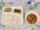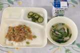 ・ピリ辛丼 ・中華スープ ・きゅうりの甘酢づけ ・ごはん ・牛乳 ...
