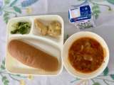・白身魚フリッター ・ミネストローネ ・ブロッコリーのサラダ ・黒糖パン ・牛乳...