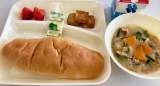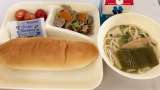 今日の献立は、コッペパン、ブルーベリージャム、牛乳、豚肉とごぼうの煮もの、なにわ...