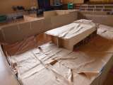 講堂は、多くの避難者の居住スペースとなります。段ボールの間仕切りで2.5畳に3...