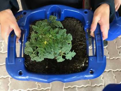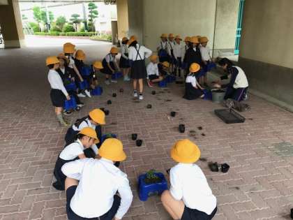2年生がミニトマトの苗を自分の植木鉢に植えました。