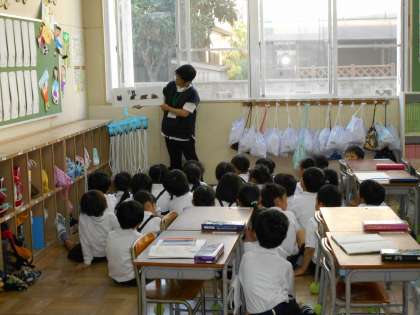 初めての1年生は読んでくださる方のところに集まり、興味深く絵本に見入っていました。