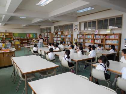 1年生が図書館の使い方について、図書館補助員の先生からお話を聞きました。
